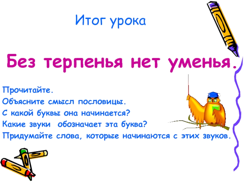 Итог урока Без терпенья нет уменья.Прочитайте.Объясните смысл пословицы.С какой буквы она начинается?Какие звуки обозначает эта буква?Придумайте