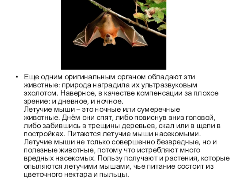 Летучие мыши – это ночные или сумеречные животные. Днём они спят, либо повиснув вниз головой, либо забившись в трещины деревьев, скал или в щели в постройках. Питаются летучие мыши насекомыми. Летучие мыши не только совершенно безвредные, но и полезные животные, потому что истребляют много вредных насекомых. Пользу получают и растения, которые опыляются летучими мышами, чье питание состоит из цветочного нектара и пыльцы.