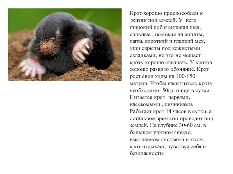 и сильная шея, сильные , похожие на лопаты, лапы, короткий и гладкий мех, уши скрыты под кожистыми складками, но это не мешает кроту хорошо слышать. У кротов хорошо развито обоняние. Крот роет свои ходы на 100-150 метров. Чтобы насытиться, кроту необходимо 50гр. пищи в сутки. Питается крот червями, насекомыми , личинками. Работает крот 14 часов в сутки, а остальное время он проводит под землей. На глубине 30-60 см, в большом уютном гнезде, выстланном листьями и мхом, крот отдыхает, чувствуя себя в безопасности.