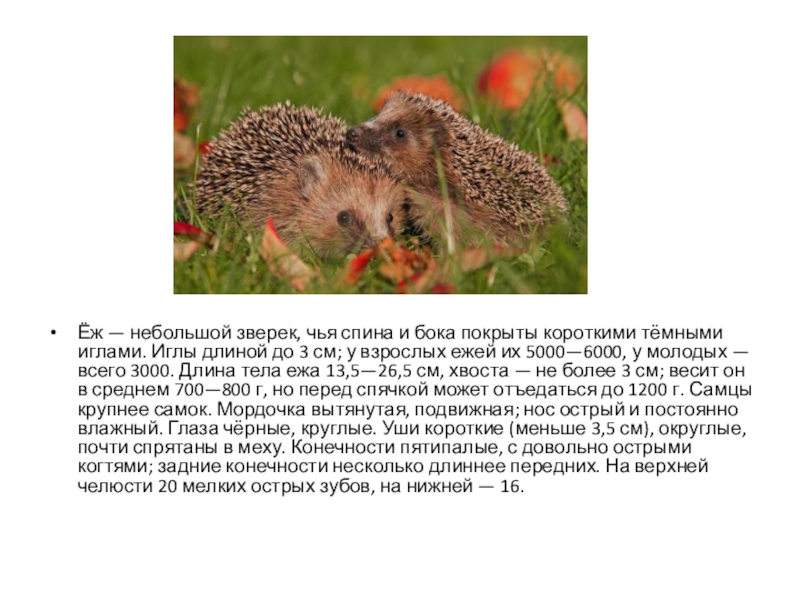 иглами. Иглы длиной до 3 см; у взрослых ежей их 5000—6000, у молодых — всего 3000. Длина тела ежа 13,5—26,5 см, хвоста — не более 3 см; весит он в среднем 700—800 г, но перед спячкой может отъедаться до 1200 г. Самцы крупнее самок. Мордочка вытянутая, подвижная; нос острый и постоянно влажный. Глаза чёрные, круглые. Уши короткие (меньше 3,5 см), округлые, почти спрятаны в меху. Конечности пятипалые, с довольно острыми когтями; задние конечности несколько длиннее передних. На верхней челюсти 20 мелких острых зубов, на нижней — 16.
