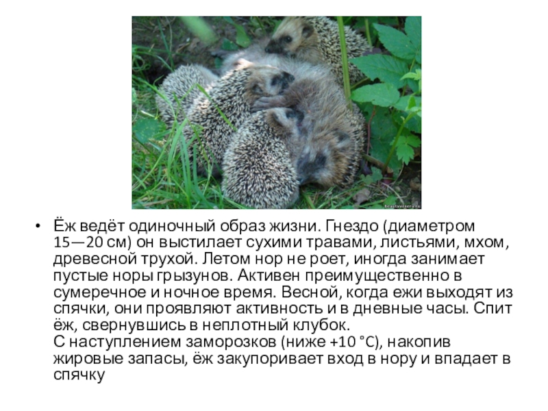 сухими травами, листьями, мхом, древесной трухой. Летом нор не роет, иногда занимает пустые норы грызунов. Активен преимущественно в сумеречное и ночное время. Весной, когда ежи выходят из спячки, они проявляют активность и в дневные часы. Спит ёж, свернувшись в неплотный клубок.