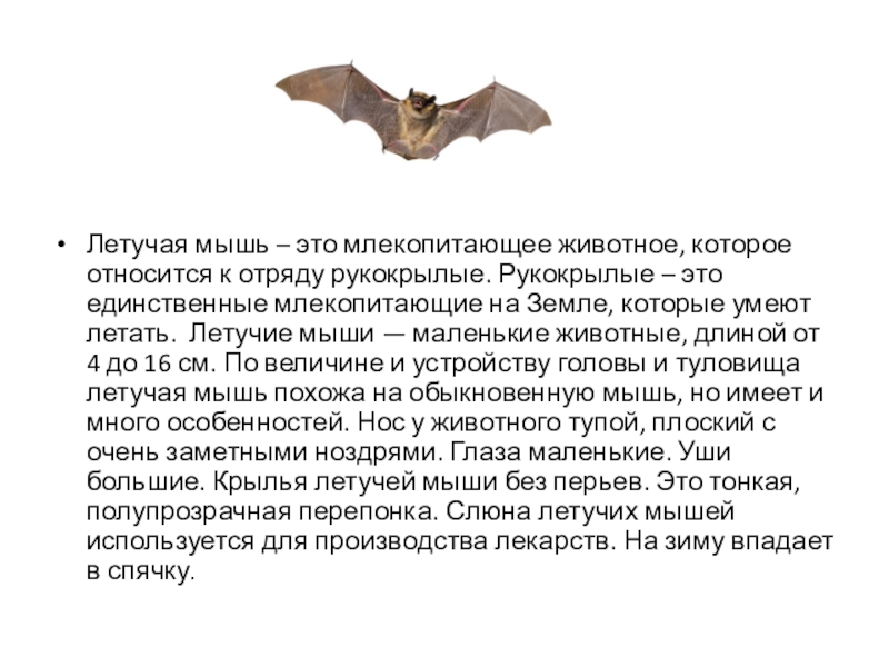 это единственные млекопитающие на Земле, которые умеют летать. Летучие мыши — маленькие животные, длиной от 4 до 16 см. По величине и устройству головы и туловища летучая мышь похожа на обыкновенную мышь, но имеет и много особенностей. Нос у животного тупой, плоский с очень заметными ноздрями. Глаза маленькие. Уши большие. Крылья летучей мыши без перьев. Это тонкая, полупрозрачная перепонка. Слюна летучих мышей используется для производства лекарств. На зиму впадает в спячку.