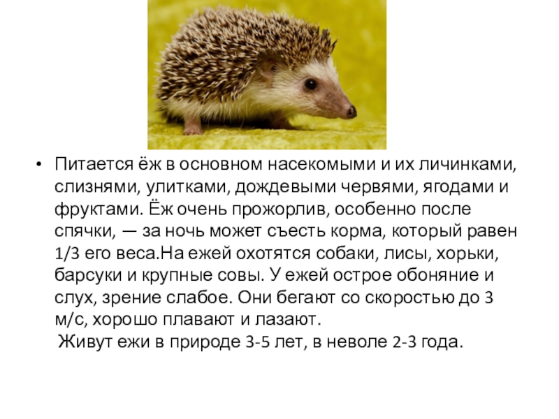 червями, ягодами и фруктами. Ёж очень прожорлив, особенно после спячки, — за ночь может съесть корма, который равен 1/3 его веса.На ежей охотятся собаки, лисы, хорьки, барсуки и крупные совы. У ежей острое обоняние и слух, зрение слабое. Они бегают со скоростью до 3 м/с, хорошо плавают и лазают.