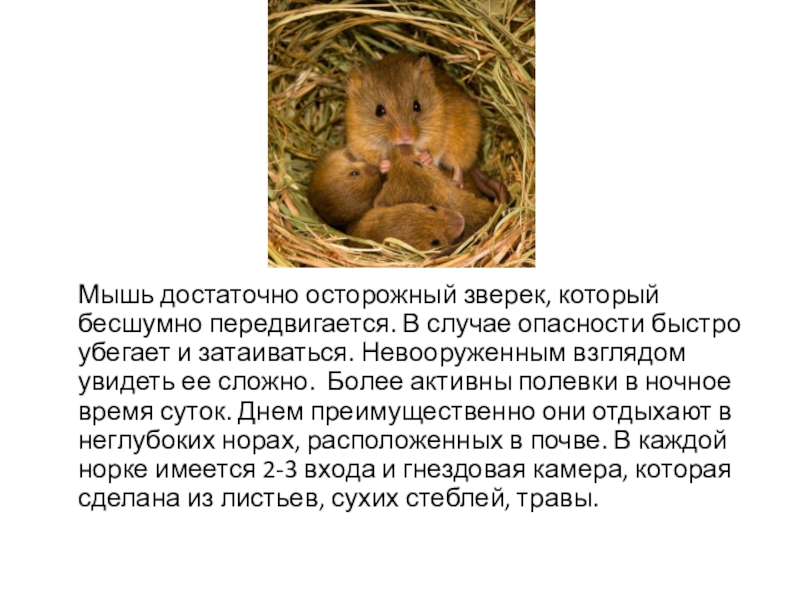 Мышь достаточно осторожный зверек, который бесшумно передвигается. В