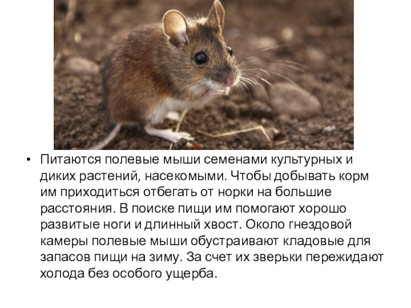 Питаются полевые мыши семенами культурных и диких растений, насекомыми. Чтобы добывать