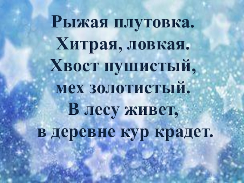 Рыжая плутовка. Хитрая, ловкая.Хвост пушистый, мех золотистый.В лесу живет, в деревне кур крадет.