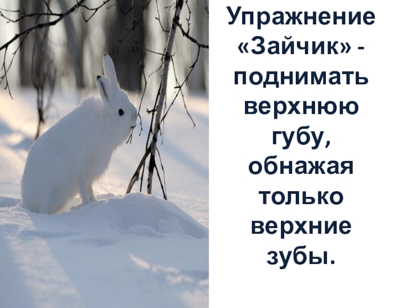 Слайд 24Упражнение «Зайчик» - поднимать верхнюю губу, обнажая только верхние зубы.