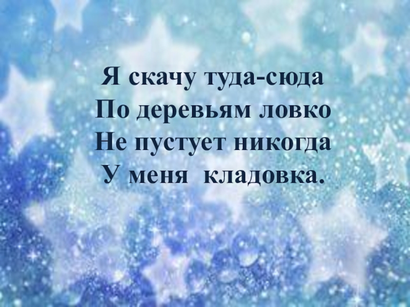 Я скачу туда-сюда По деревьям ловкоНе пустует никогдаУ меня кладовка.