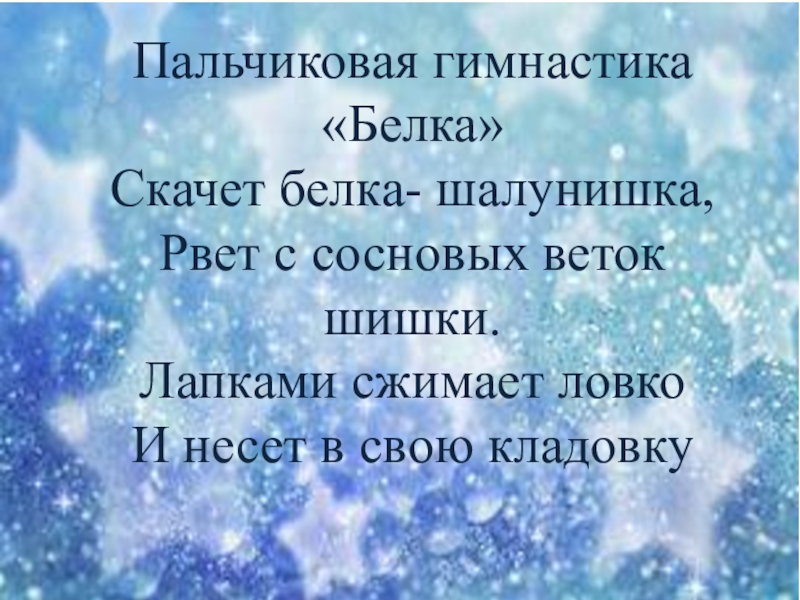 Пальчиковая гимнастика «Белка»Скачет белка- шалунишка,Рвет с сосновых веток шишки.Лапками сжимает ловко И несет в свою кладовку