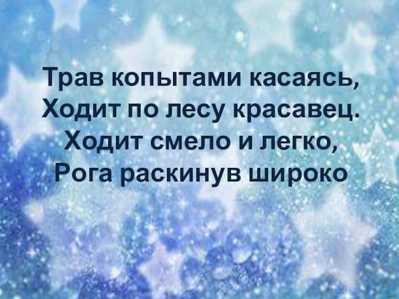 Трав копытами касаясь,Ходит по лесу красавец.Ходит смело и легко,Рога раскинув широко