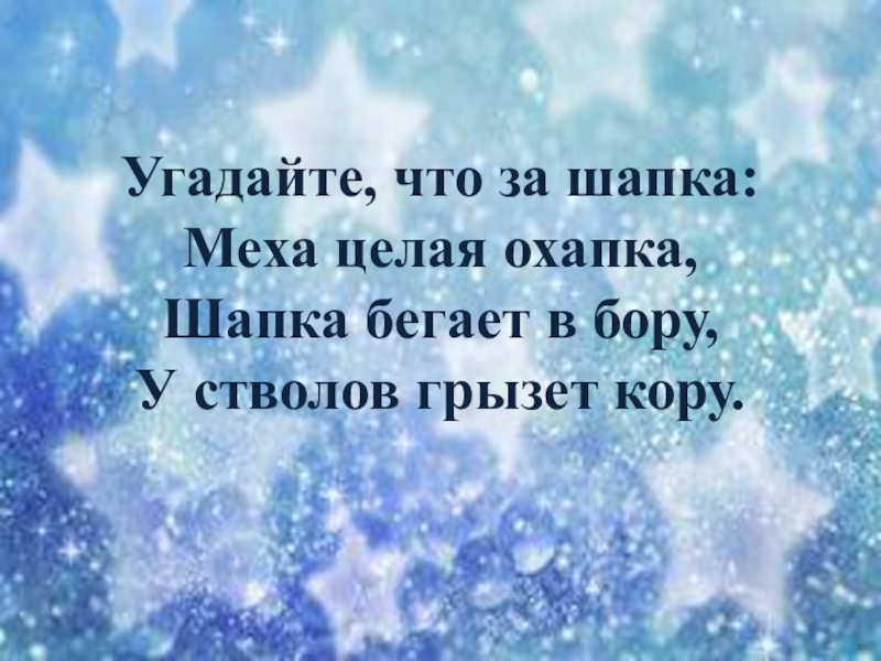 Угадайте, что за шапка:Меха целая охапка, Шапка бегает в бору, У стволов грызет кору.