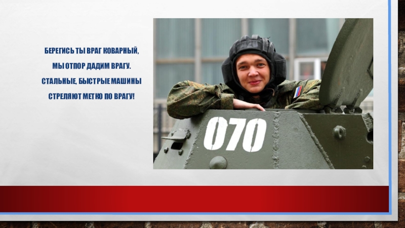 Берегись ты враг коварный,Мы отпор дадим врагу.Стальные, быстрые машиныСтреляют метко по врагу!