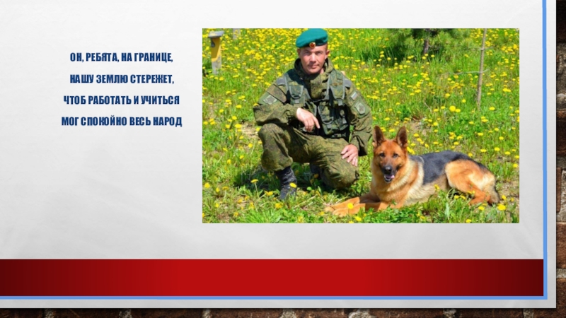 Он, ребята, на границе,Нашу землю стережет,Чтоб работать и учитьсяМог спокойно весь народ
