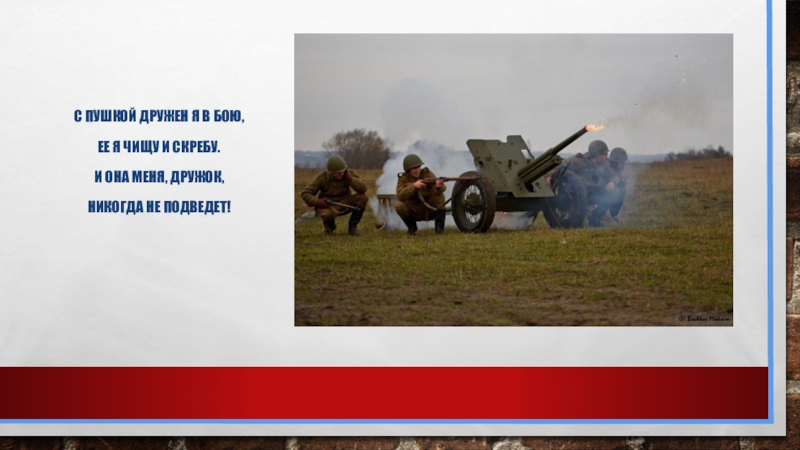 С пушкой дружен я в бою,Ее я чищу и скребу.И она меня, дружок,Никогда не подведет!