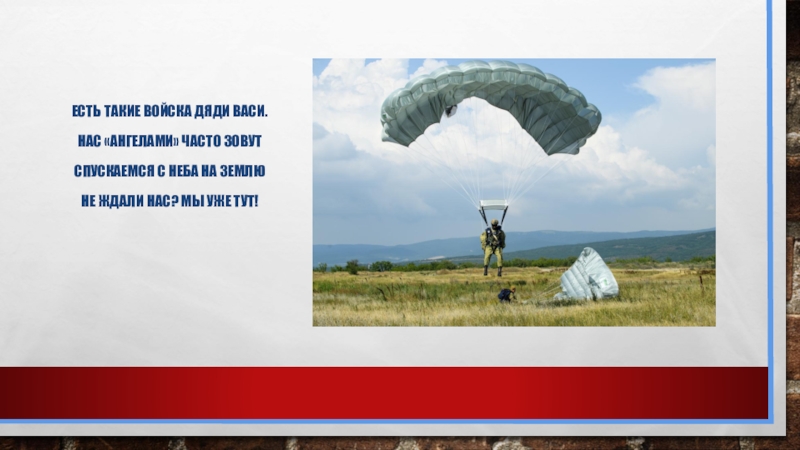 Есть такие войска Дяди Васи.Нас «ангелами» часто зовутСпускаемся с неба на землюНе ждали нас? Мы уже тут!