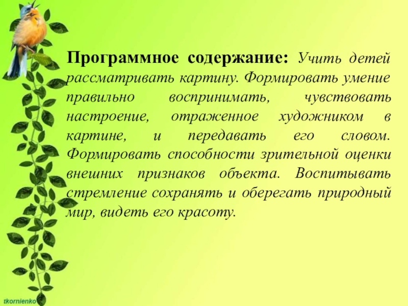 отраженное художником в картине, и передавать его словом. Формировать способности зрительной оценки внешних признаков объекта. Воспитывать стремление сохранять и оберегать природный мир, видеть его красоту.
