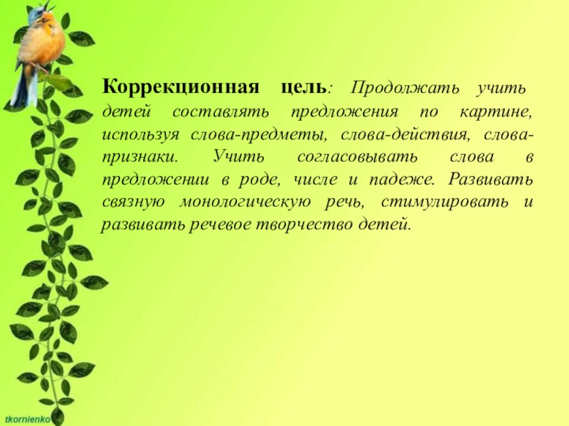 Слайд 3Коррекционная цель: Продолжать учить детей составлять предложения по картине, используя слова-предметы,