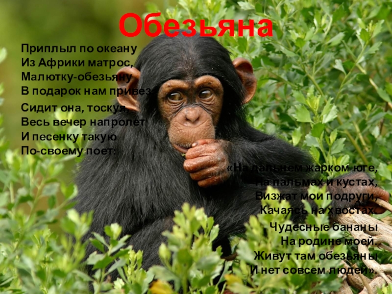 ОбезьянаПриплыл по океану Из Африки матрос, Малютку-обезьяну В подарок нам привез.Сидит она, тоскуя, Весь вечер напролет И песенку такую По-своему поет:«На дальнем жарком юге, На пальмах и кустах, Визжат мои подруги, Качаясь на хвостах.Чудесные бананы На родине моей. Живут там обезьяны И нет совсем людей».