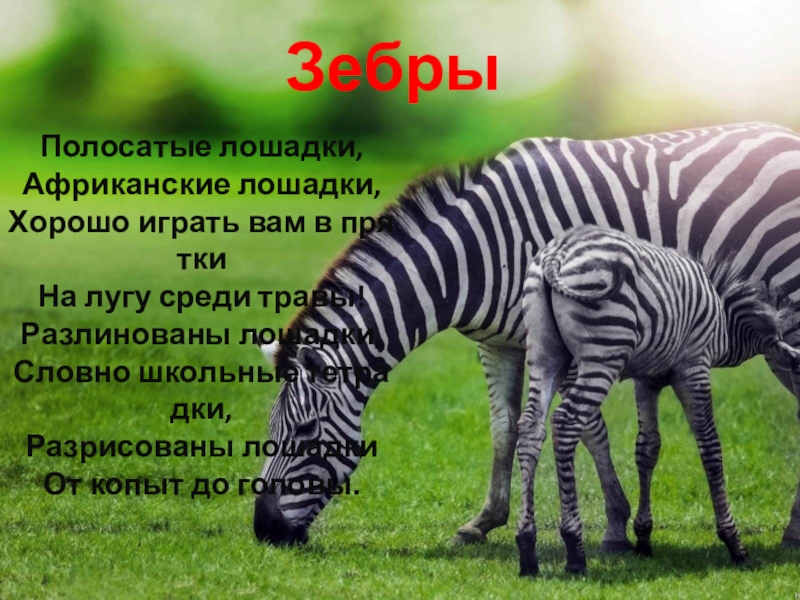 ЗебрыПолосатые лошадки, Африканские лошадки, Хорошо играть вам в прятки На лугу среди травы! Разлинованы лошадки, Словно школьные тетрадки, Разрисованы лошадки От копыт до головы.