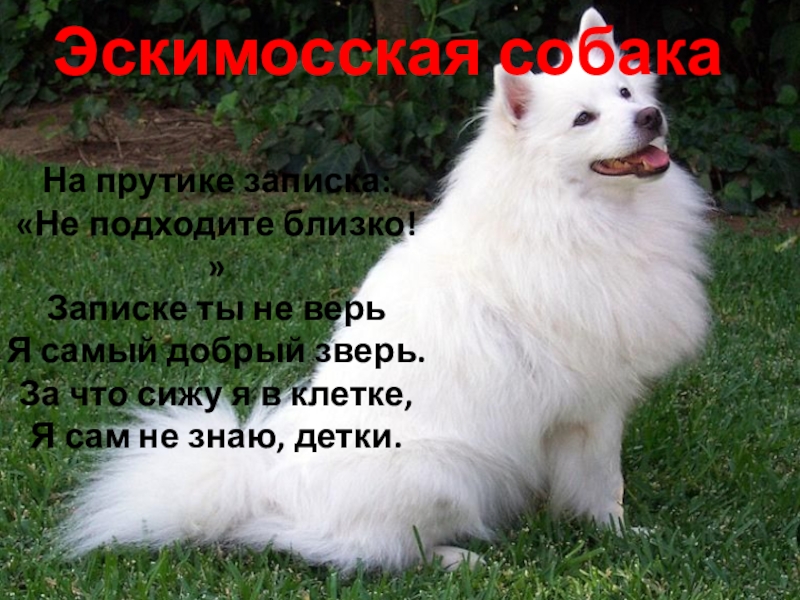 Эскимосская собакаНа прутике записка: «Не подходите близко!» Записке ты не верь Я самый добрый зверь. За что сижу я в клетке, Я сам не знаю, детки.
