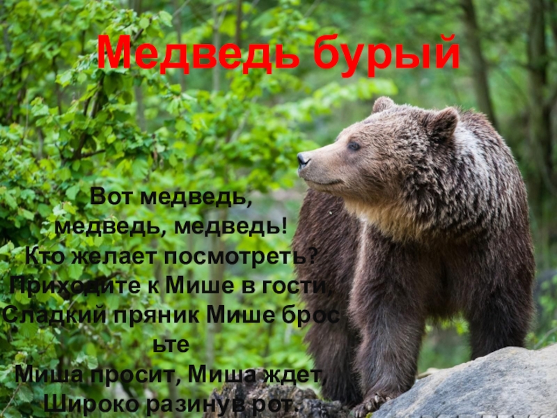 медведь, медведь! Кто желает посмотреть? Приходите к Мише в гости, Сладкий пряник Мише бросьте Миша просит, Миша ждет, Широко разинув рот.