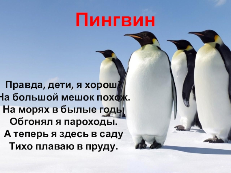 ПингвинПравда, дети, я хорош? На большой мешок похож. На морях в былые годы Обгонял я пароходы. А теперь я здесь в саду Тихо плаваю в пруду.