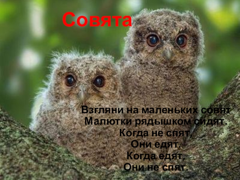 Взгляни на маленьких совят Малютки рядышком сидят. Когда не спят, Они едят. Когда едят, Они не спят.