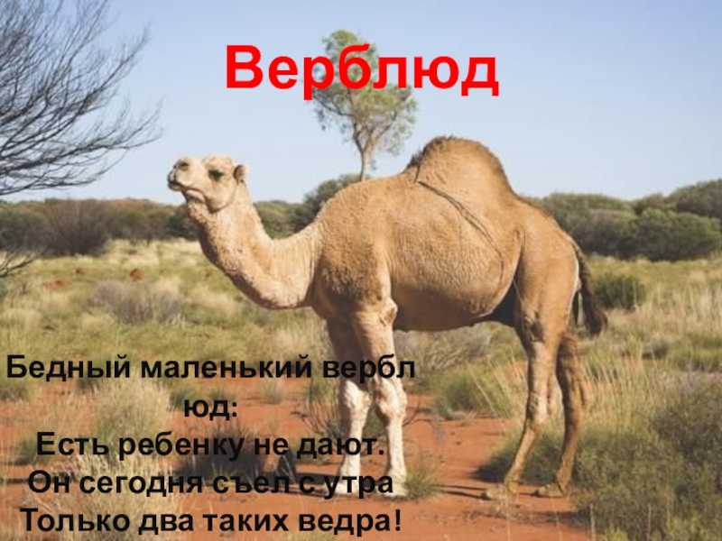 ВерблюдБедный маленький верблюд: Есть ребенку не дают. Он сегодня съел с утра Только два таких ведра!