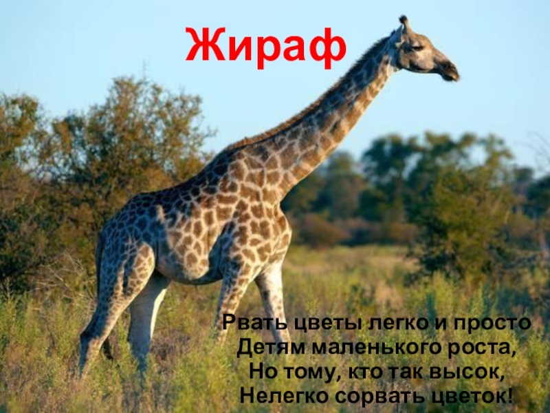 ЖирафРвать цветы легко и просто Детям маленького роста, Но тому, кто так высок, Нелегко сорвать цветок!