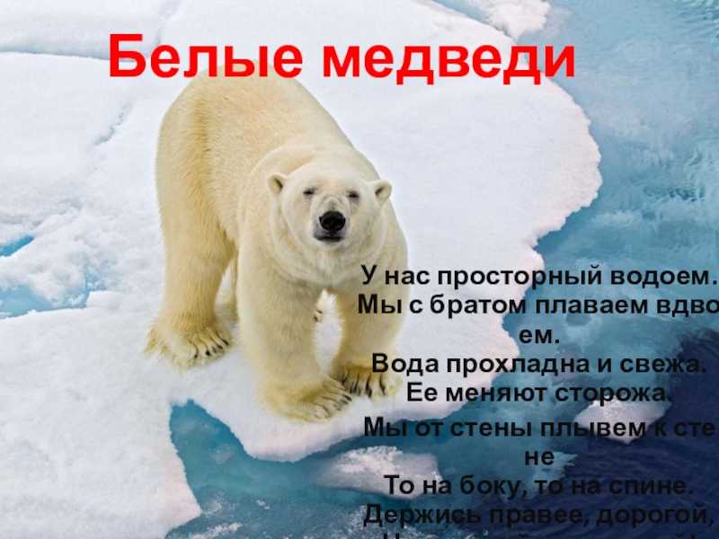 Белые медведиУ нас просторный водоем. Мы с братом плаваем вдвоем. Вода прохладна и свежа. Ее меняют сторожа.Мы от стены плывем к стене То на боку, то на спине. Держись правее, дорогой, Не задевай меня ногой!