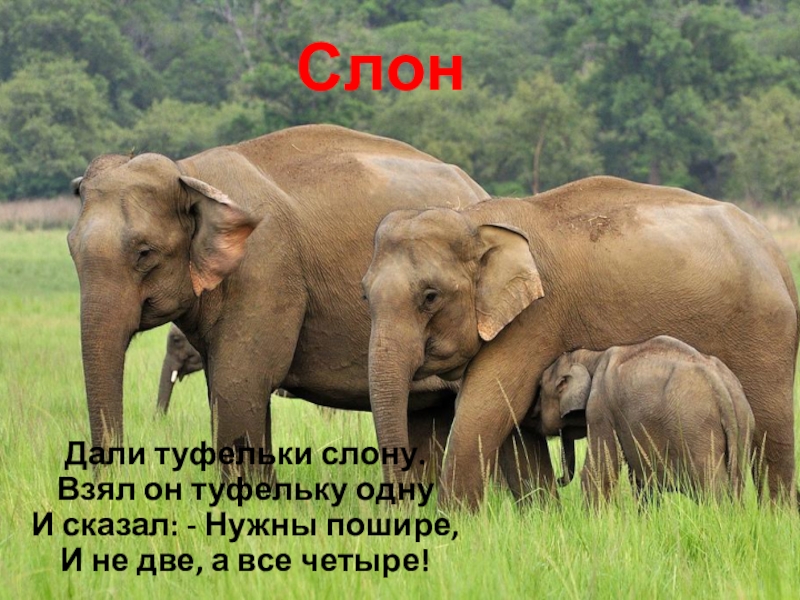 СлонДали туфельки слону. Взял он туфельку одну И сказал: - Нужны пошире, И не две, а все четыре!