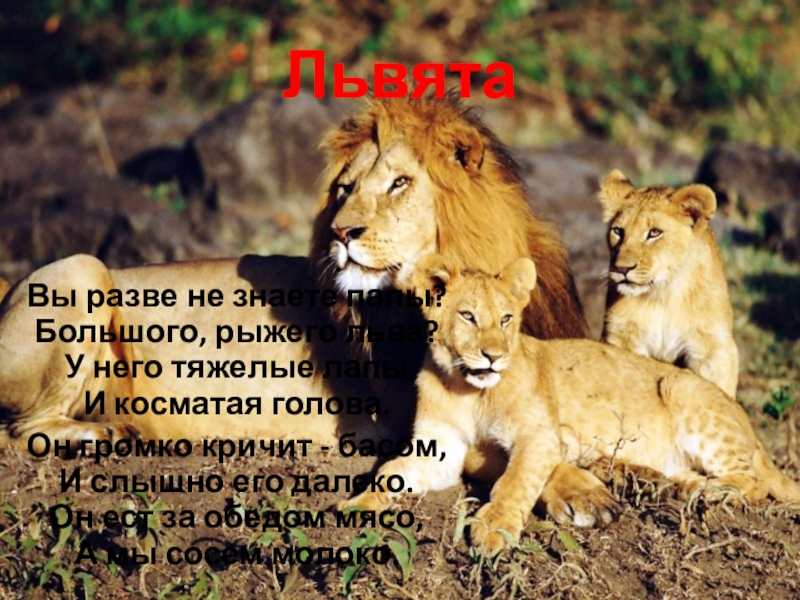 ЛьвятаВы разве не знаете папы? Большого, рыжего льва? У него тяжелые лапы И косматая голова.Он громко кричит - басом, И слышно его далеко. Он ест за обедом мясо, А мы сосем молоко.