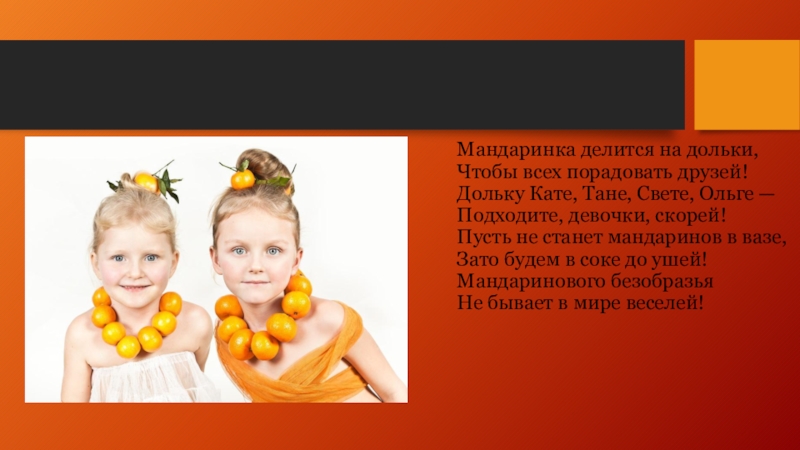 Слайд 3Мандаринка делится на дольки, Чтобы всех порадовать друзей! Дольку Кате, Тане, Свете, Ольге