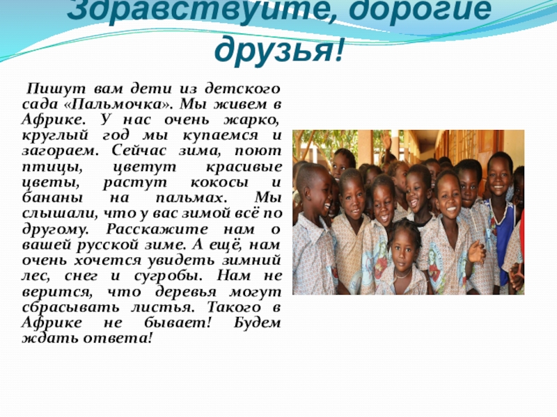 Здравствуйте, дорогие друзья! Пишут вам дети из детского сада «Пальмочка». Мы живем в Африке. У нас очень жарко, круглый год мы купаемся и загораем. Сейчас зима, поют птицы, цветут красивые цветы, растут