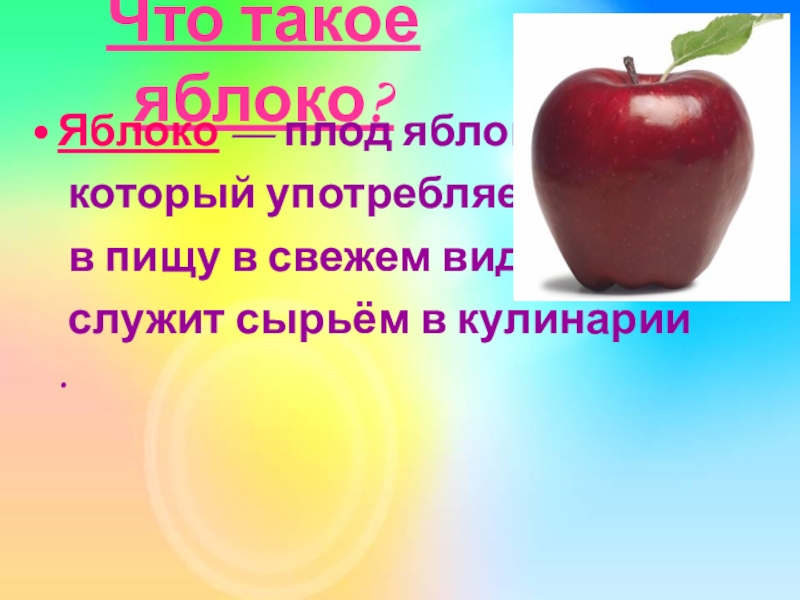 Что такое яблоко?Яблоко — плод яблони, 	который употребляется 	в пищу в свежем виде и	служит сырьём в кулинарии .