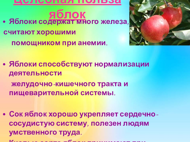 Целебная польза яблокЯблоки содержат много железа, недаром их считают хорошими	помощником при анемии.Яблоки способствуют нормализации деятельности 	желудочно-кишечного тракта