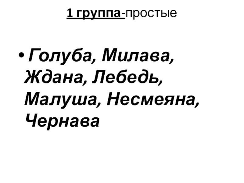 1 группа-простые  Голуба, Милава, Ждана, Лебедь, Малуша, Несмеяна, Чернава