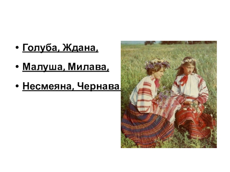 Голуба, Милава, Ждана, Лебедь, Малуша, Несмеяна, Чернава