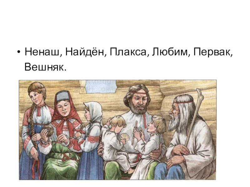 Слайд 3Ненаш, Найдён, Плакса, Любим, Первак, Вешняк.