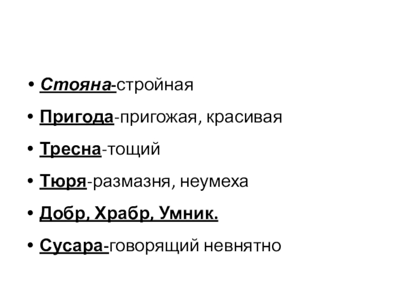 Стояна-стройнаяПригода-пригожая, красиваяТресна-тощийТюря-размазня, неумехаДобр, Храбр, Умник.Сусара-говорящий невнятно