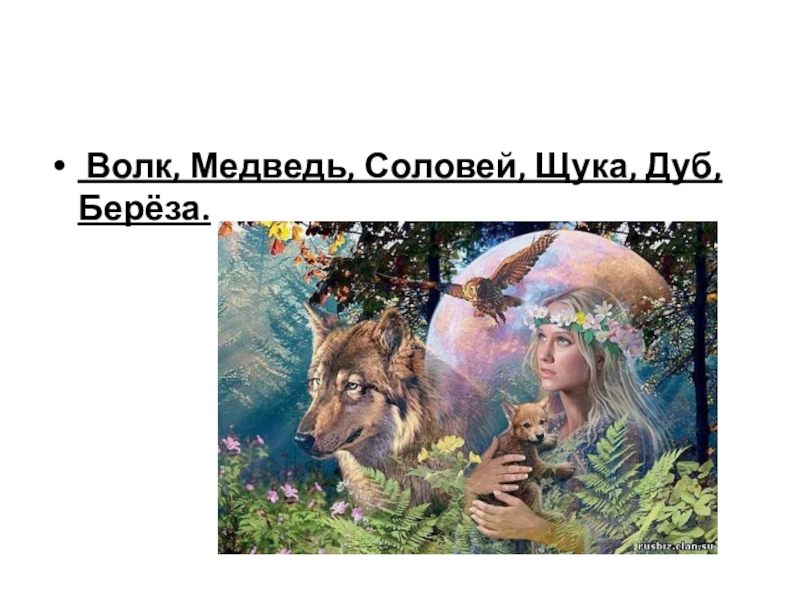 Волк, Медведь, Соловей, Щука, Дуб, Берёза.
