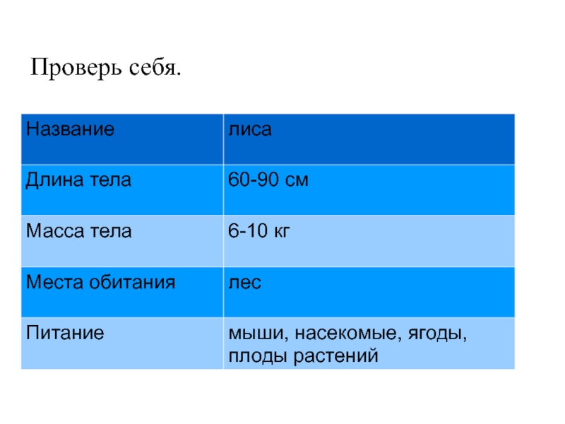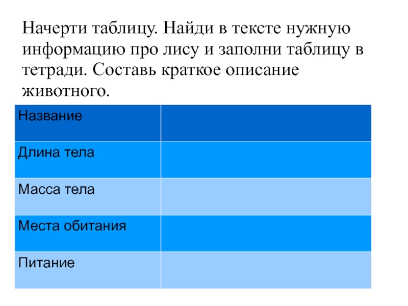 Слайд 8Начерти таблицу. Найди в тексте нужную информацию про лису и заполни