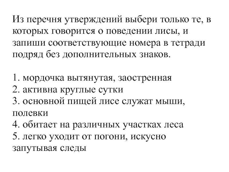 Из перечня утверждений выбери только те, в которых говорится о поведении лисы, и запиши соответствующие номера в