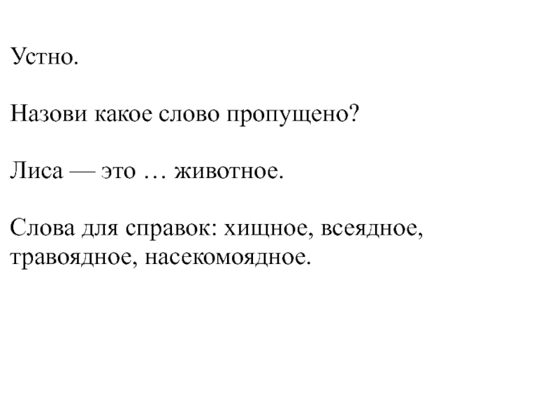 Устно.   Назови какое слово пропущено?  Лиса — это … животное.   Слова для