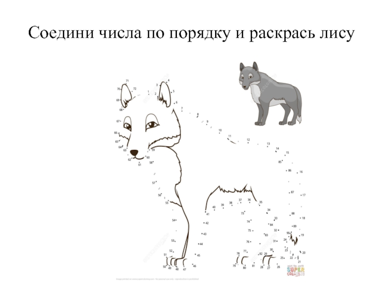 Слайд 14Соедини числа по порядку и раскрась лису