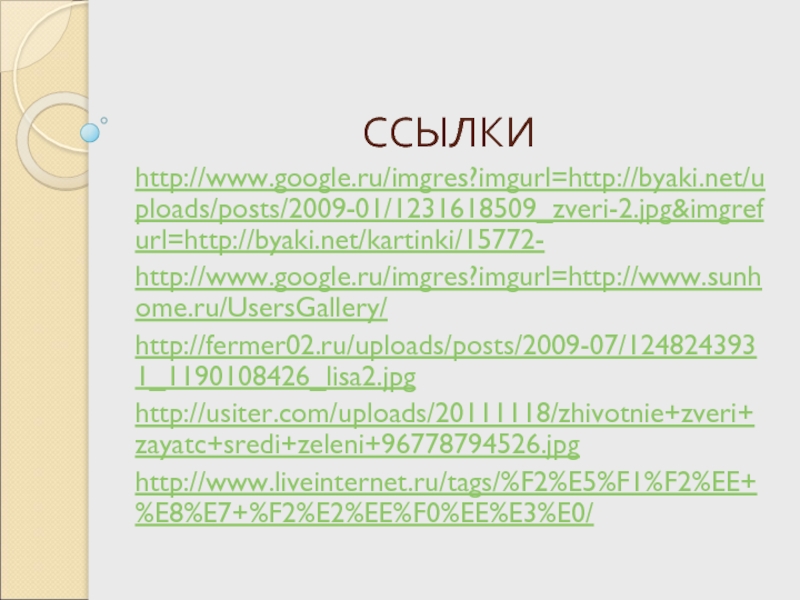 ССЫЛКИhttp://www.google.ru/imgres?imgurl=http://byaki.net/uploads/posts/2009-01/1231618509_zveri-2.jpg&imgrefurl=http://byaki.net/kartinki/15772-http://www.google.ru/imgres?imgurl=http://www.sunhome.ru/UsersGallery/http://fermer02.ru/uploads/posts/2009-07/1248243931_1190108426_lisa2.jpghttp://usiter.com/uploads/20111118/zhivotnie+zveri+zayatc+sredi+zeleni+96778794526.jpghttp://www.liveinternet.ru/tags/%F2%E5%F1%F2%EE+%E8%E7+%F2%E2%EE%F0%EE%E3%E0/