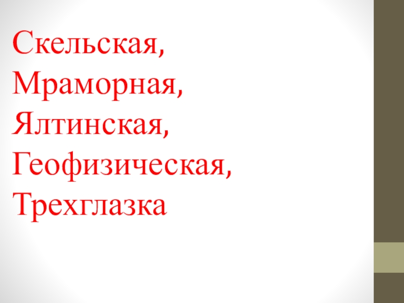Слайд 17Скельская, Мраморная, Ялтинская, Геофизическая,