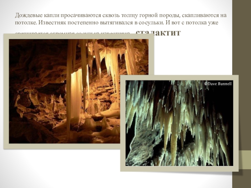 Слайд 8Дождевые капли просачиваются сквозь толщу горной породы, скапливаются на потолке. Известняк