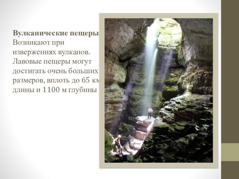 Возникают при извержениях вулканов. Лавовые пещеры могут достигать очень больших