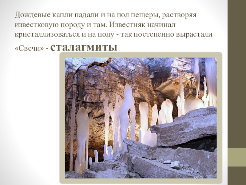 Слайд 9Дождевые капли падали и на пол пещеры, растворяя известковую породу и